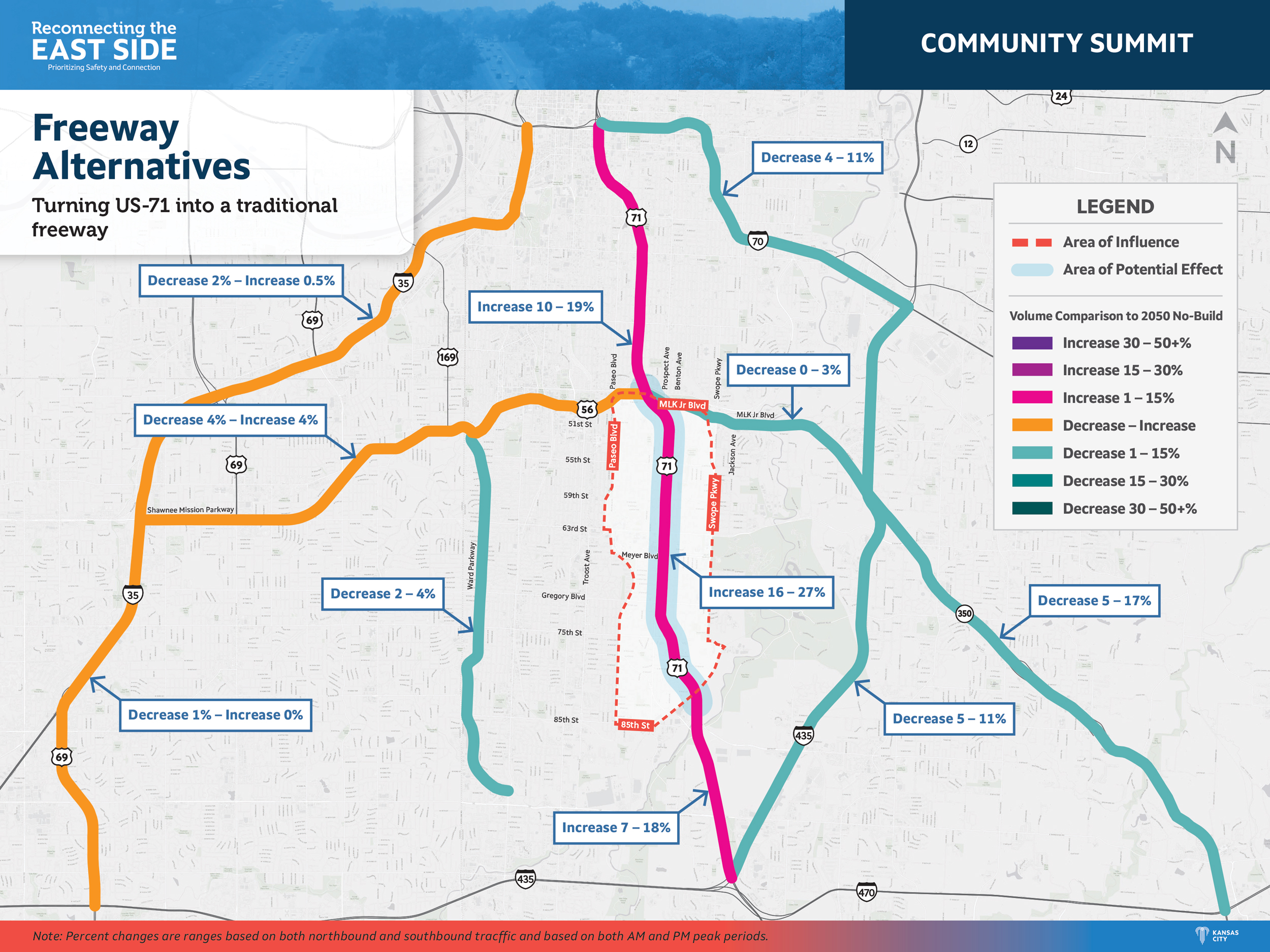The purpose of the Reconnecting the East Side project is to address safety, multimodal access and mobility, and congestion challenges on the US-71 corridor.